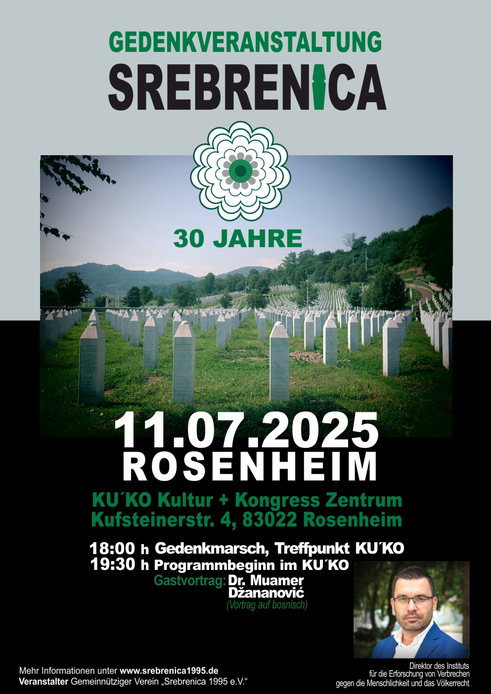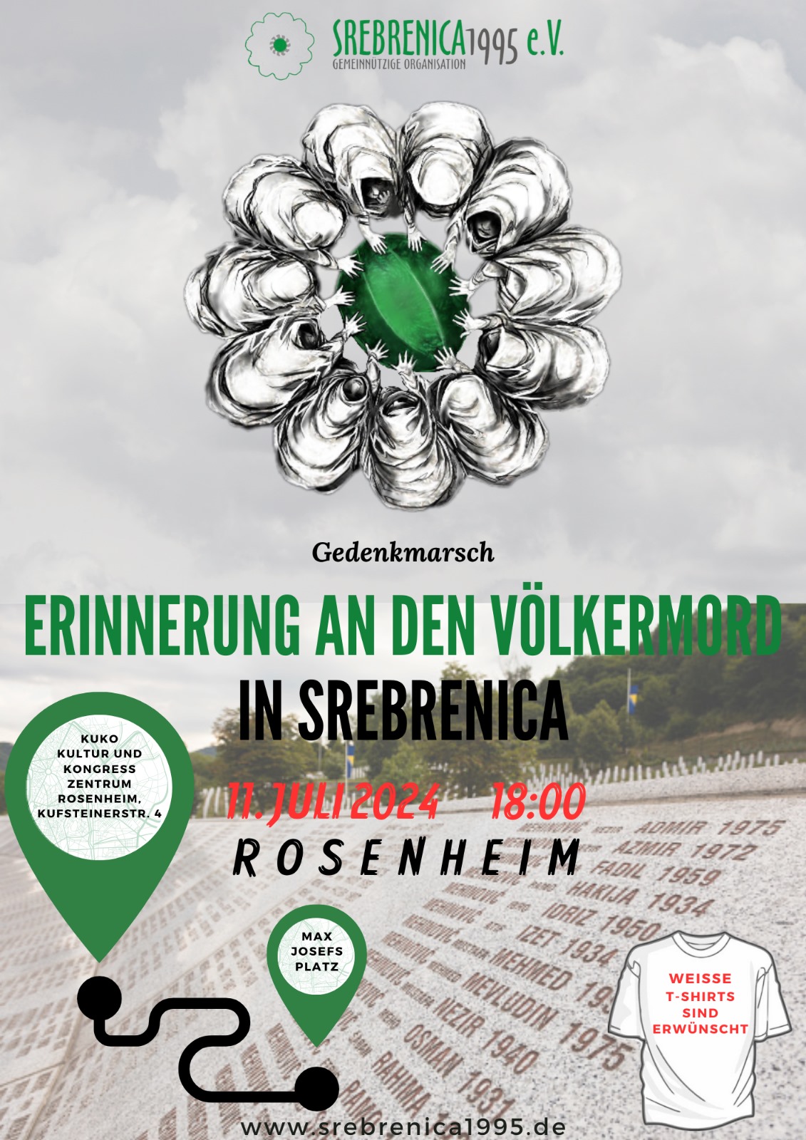 Hiermit laden wir Sie herzlich ein, am FRIEDENSMARSCH und der würdevollen Gedenkveranstaltung „Erinnerung an den Genozid in Srebrenica“ teilzunehmen, die am Freitag, den 11. Juli 2025 um 18:00 Uhr in Rosenheim stattfinden wird.